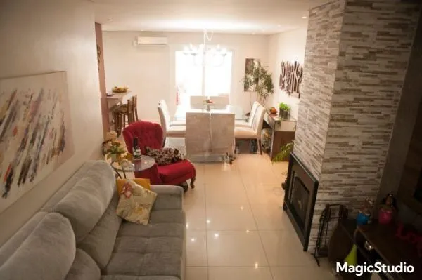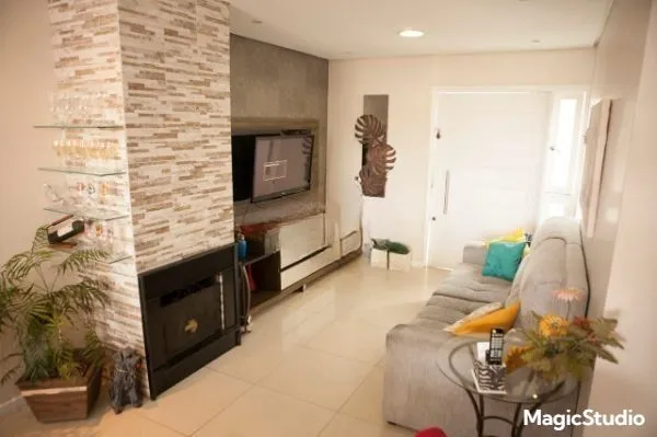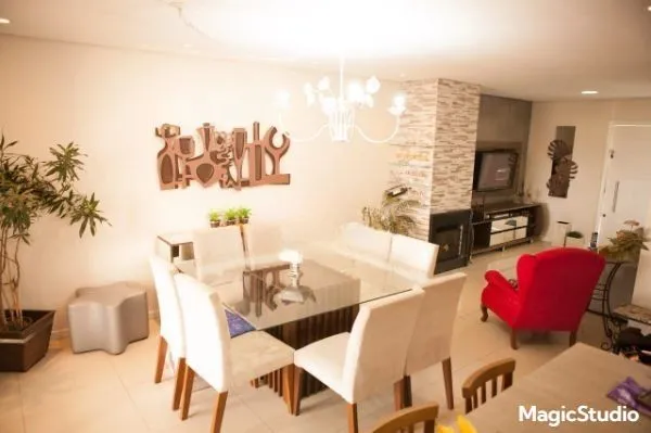 Na área social, o destaque fica para o living amplo para dois ambientes, com lareira e lavabo, integrando-se de forma harmoniosa à sala de jantar.