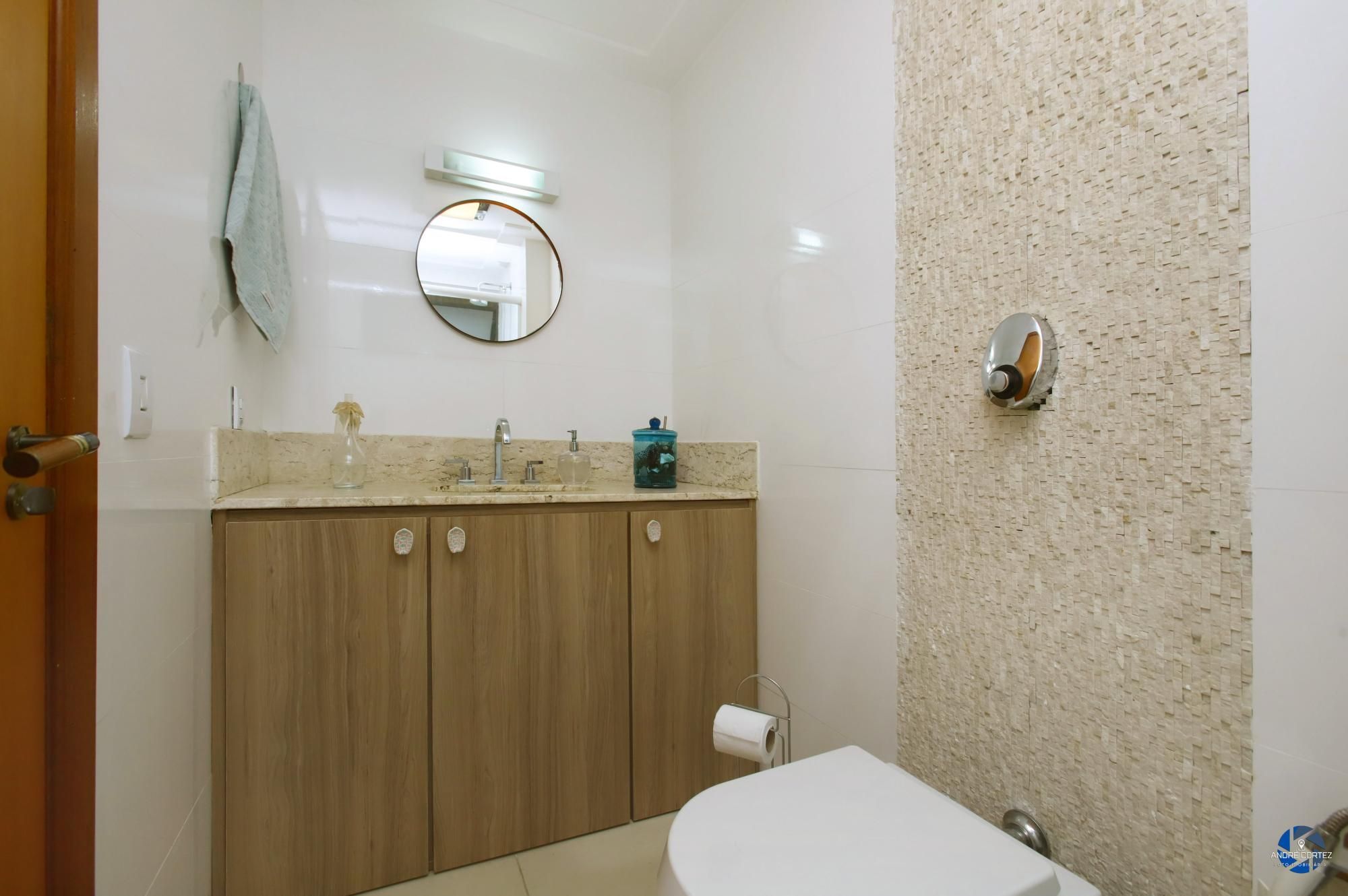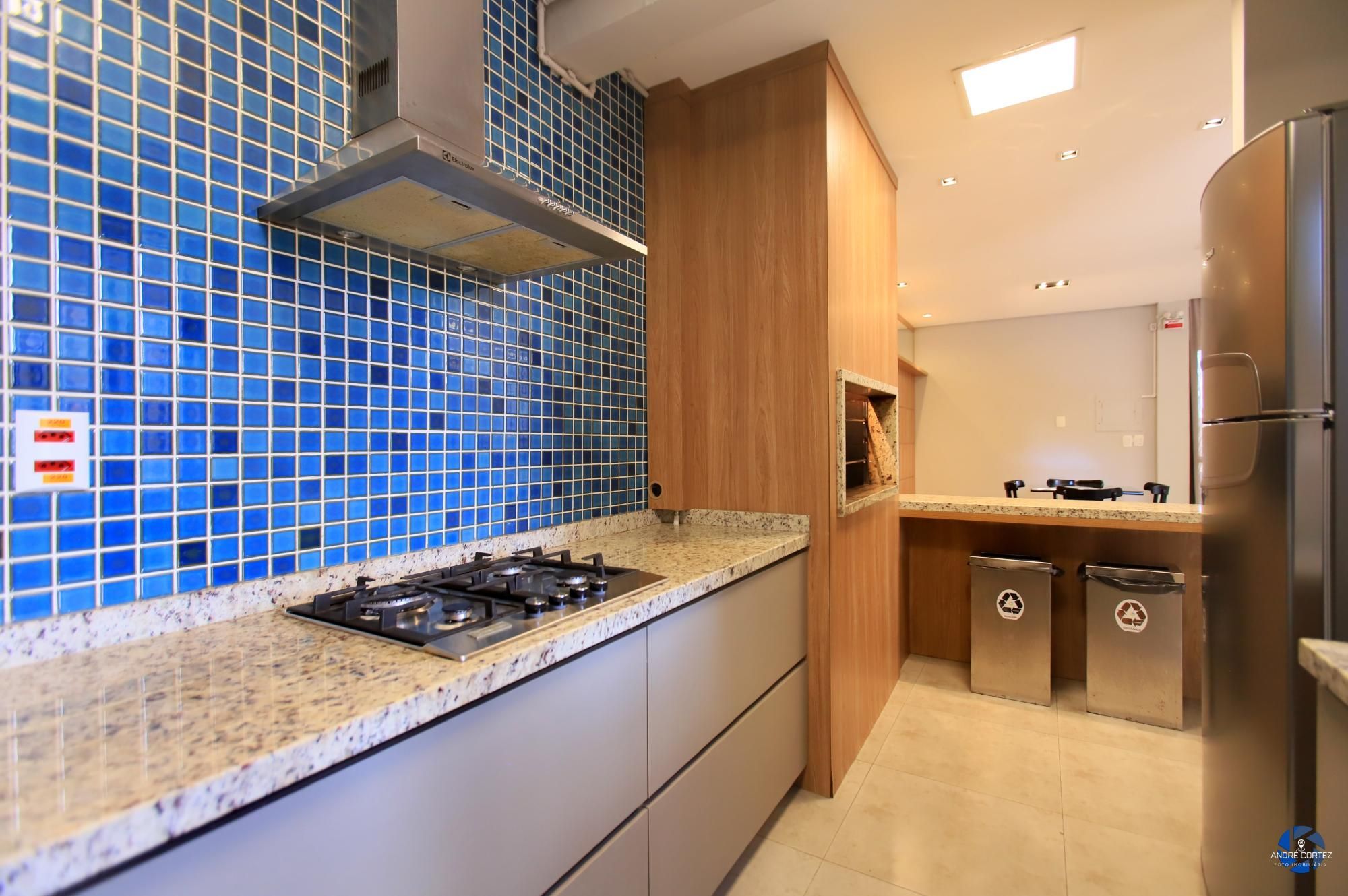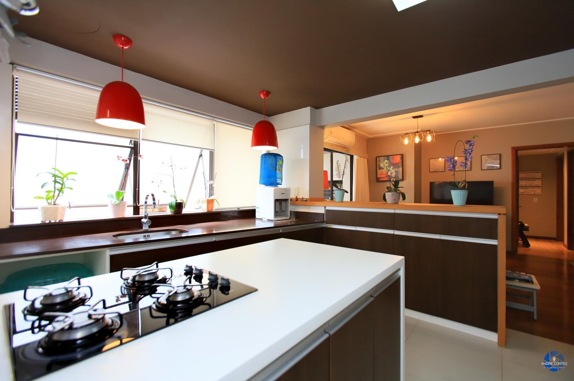 O apartamento possui hall de entrada, lavabo e uma cozinha espaçosa, equipada com móveis sob medida e integrada aos ambientes de estar e jantar, criando um espaço moderno e funcional.