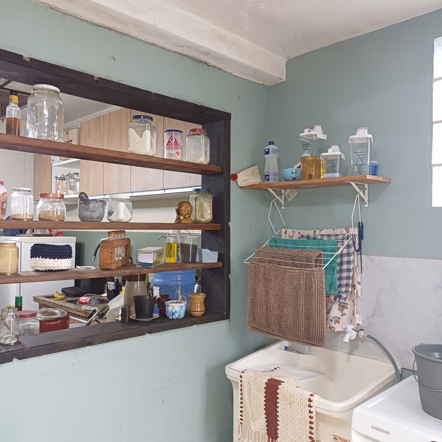 - Sala de circulação entre o banheiro e a cozinha, onde está a escada para o andar superior