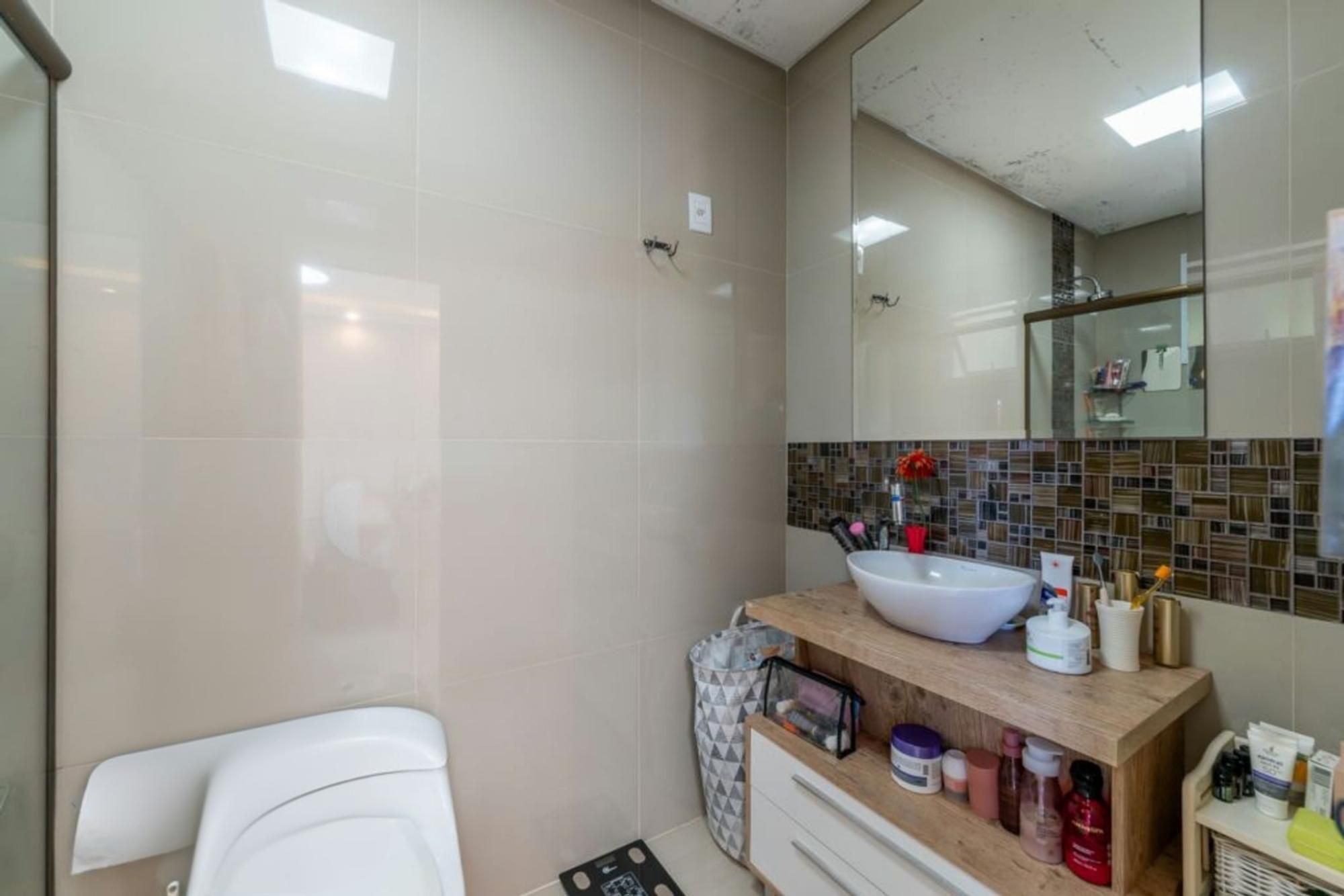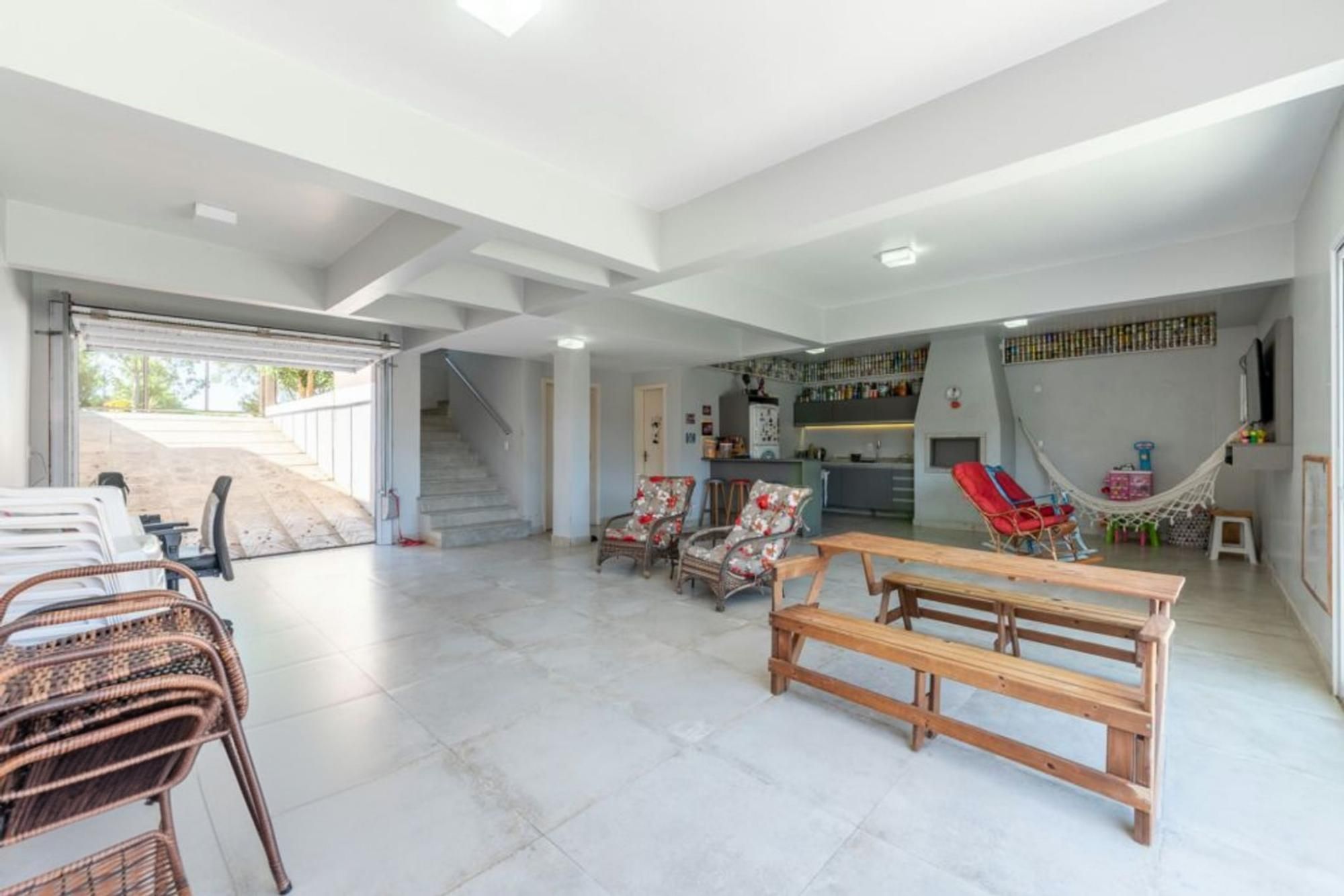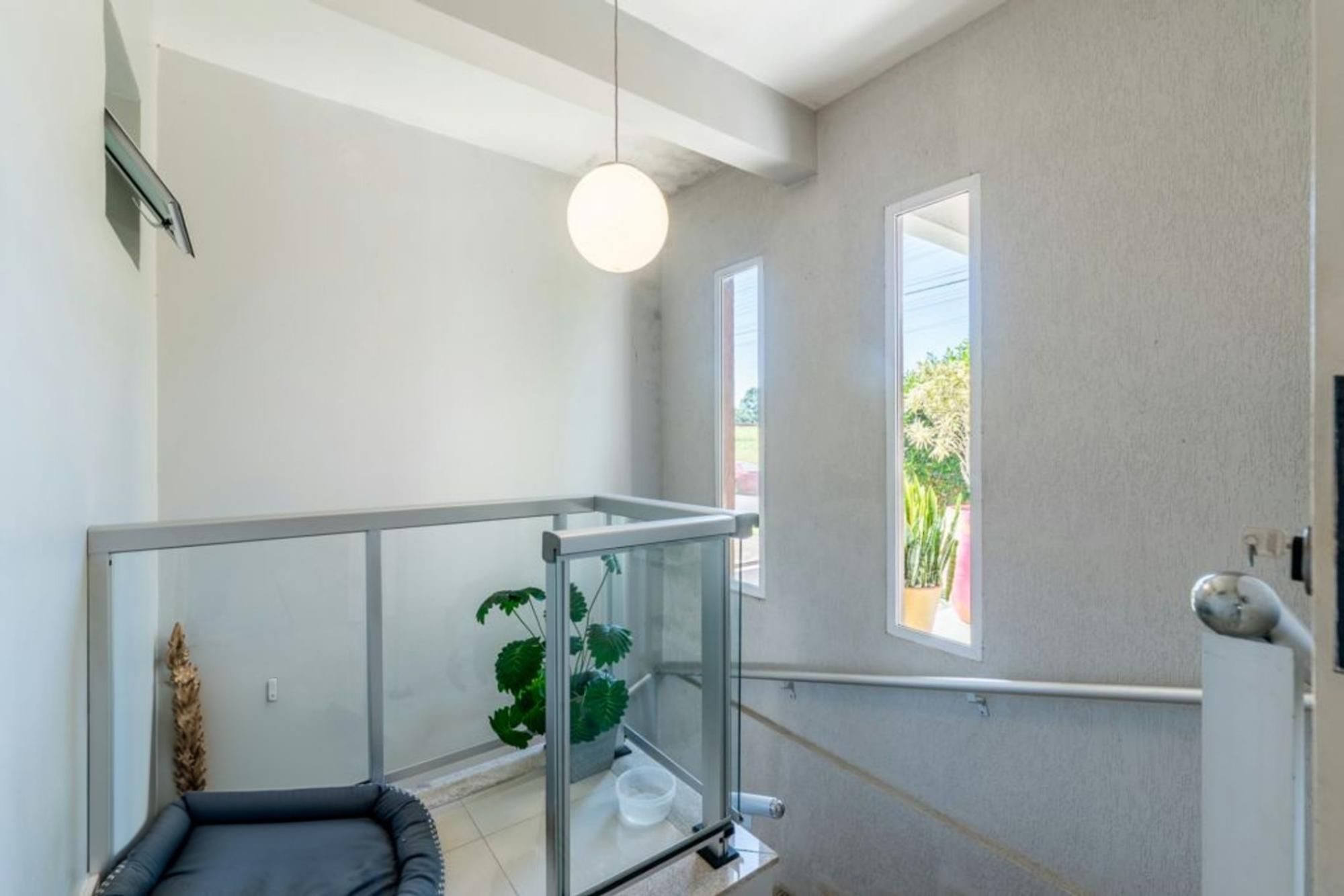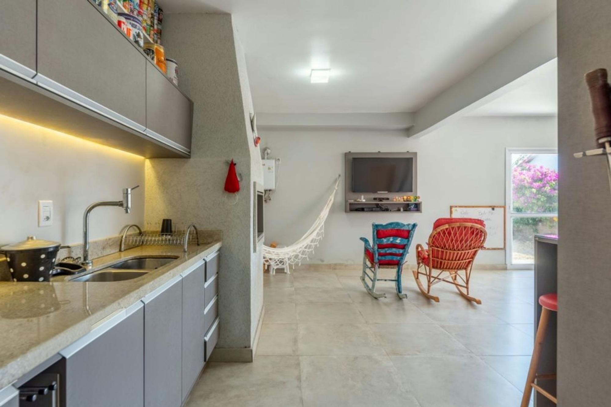 Casa em condomínio fechado de 3 dormitórios, sendo um no andar térreo e dois no andar superior, com mais um banheiro, sala com dois ambientes, cozinha, área fechada nos fundos com churrasqueira, lavabo. Uma vaga na frente.