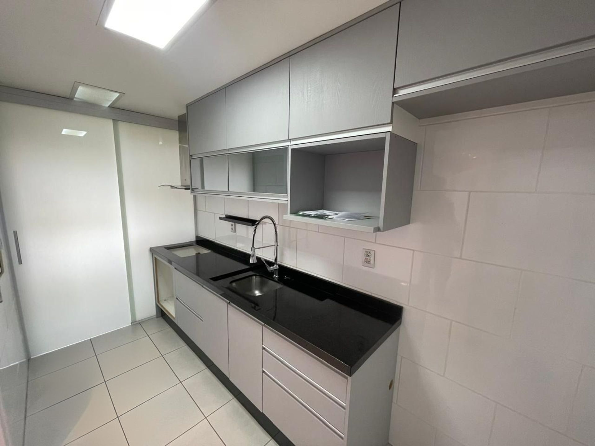 Cozinha com moveis planejados e área de serviço.