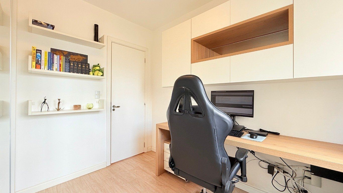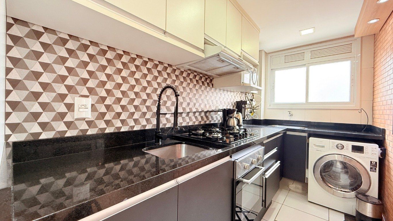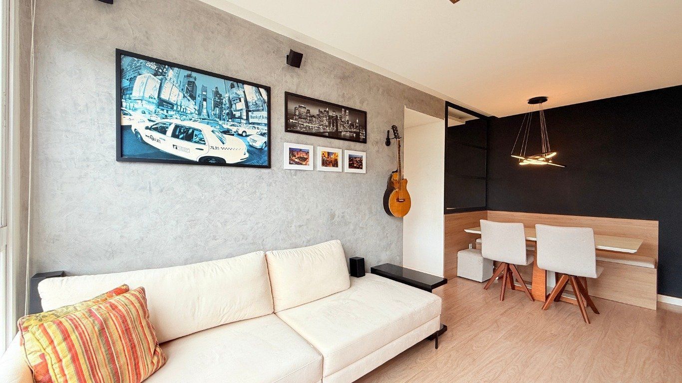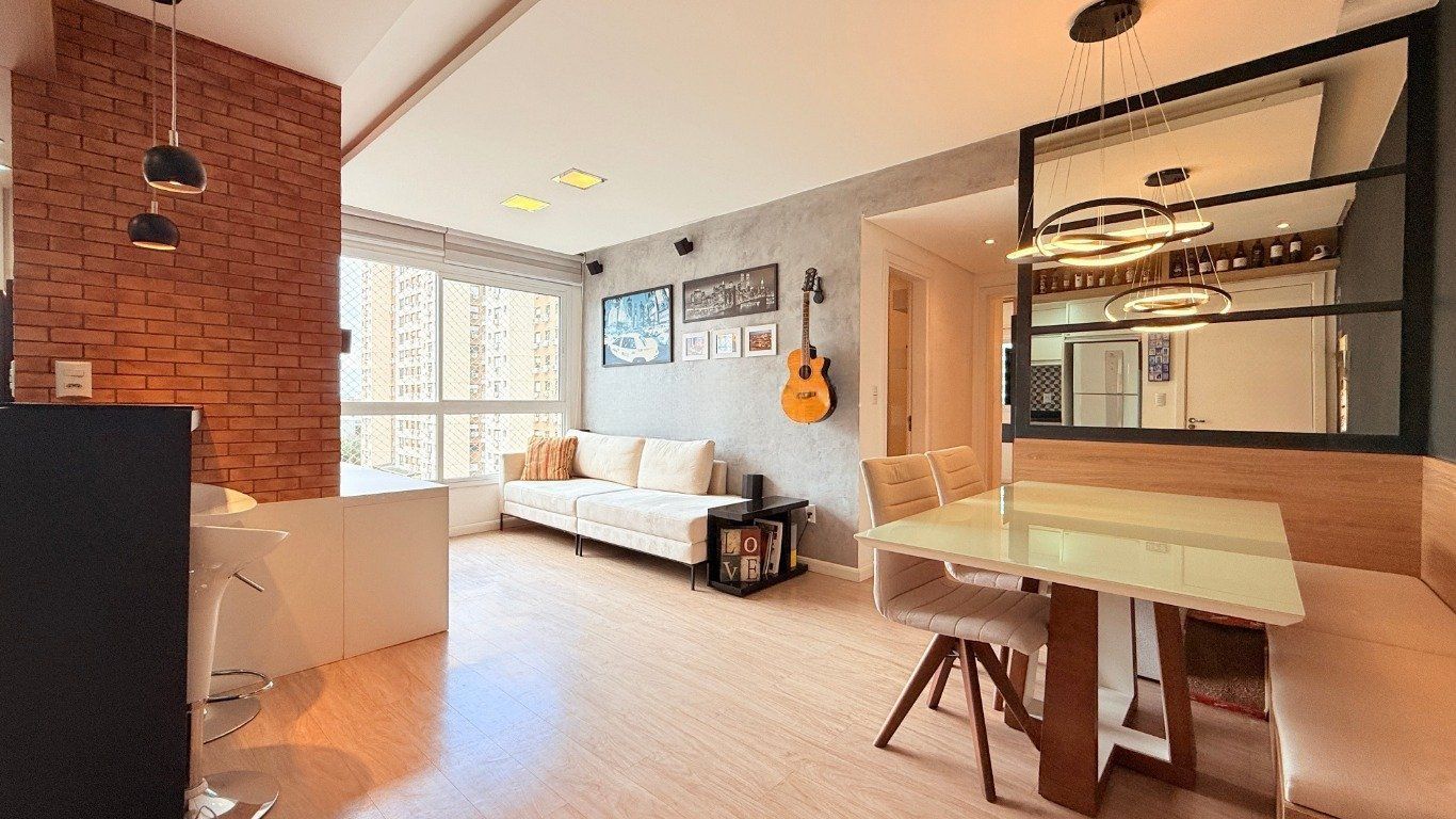 Apartamento de 2 dormitórios com suíte, sala ampla com 2 ambientes decorados, cozinha americana com churrasqueira, móveis planejados e área de serviço integrada. Banheiro com ventilação natural.