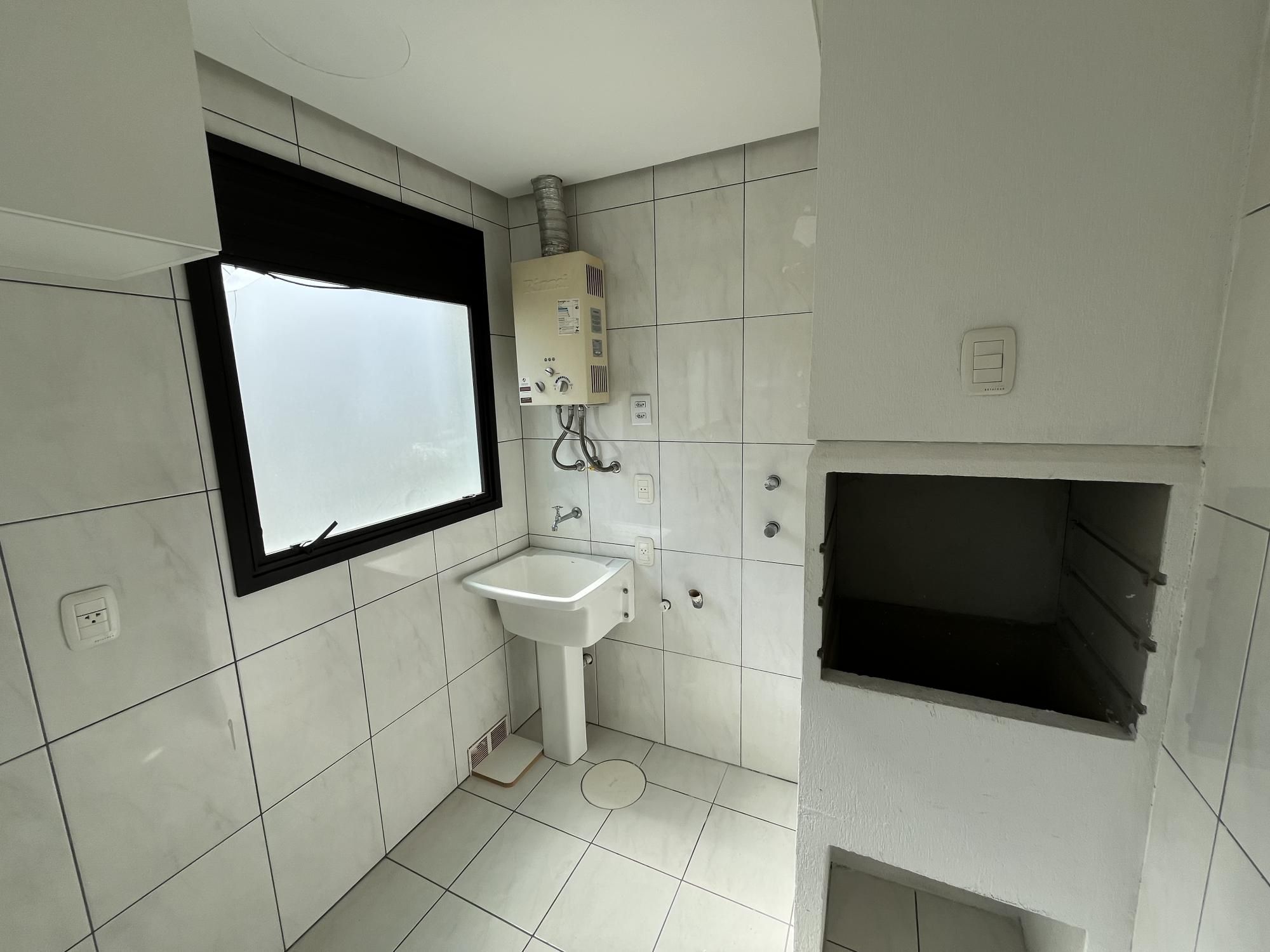 Living para 2 ambientes, cozinha com churrasqueira e banheiro social.