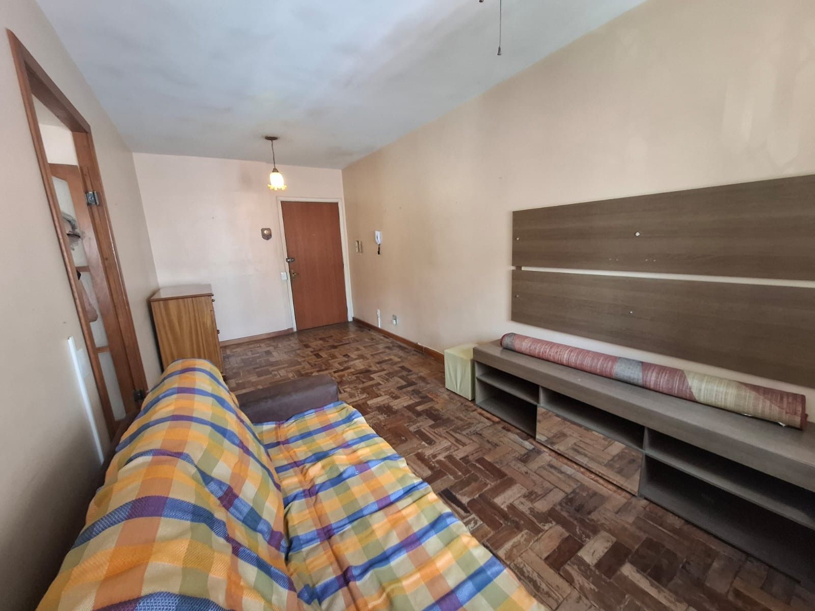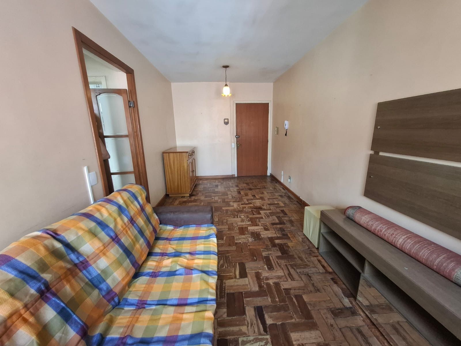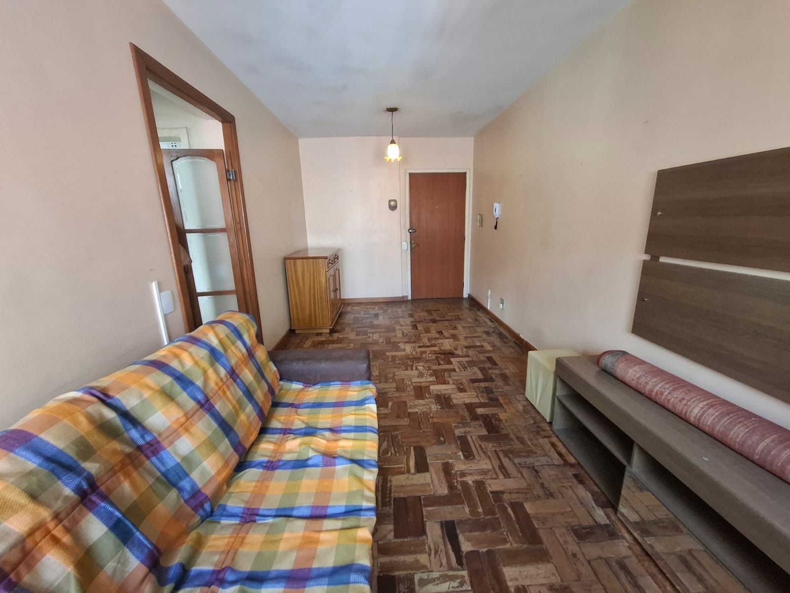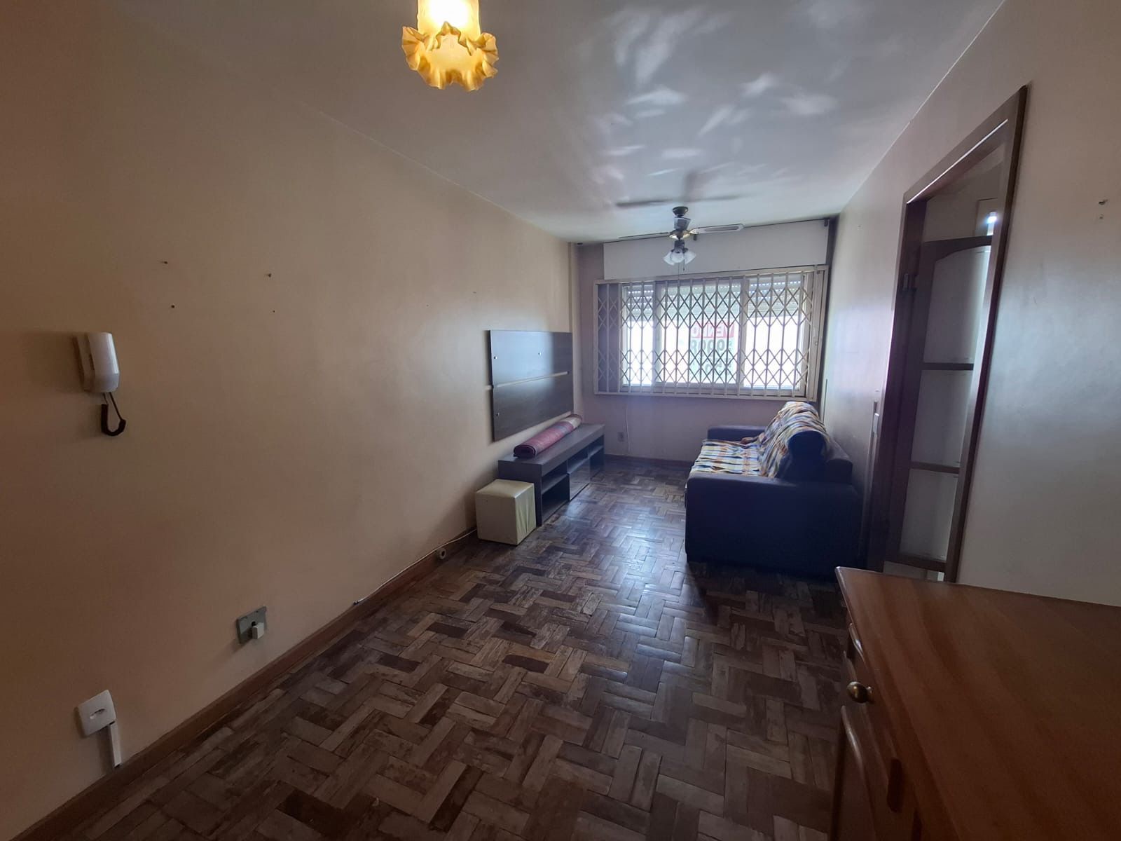 Apartamento de 1 quarto no centro de Porto Alegre/RS - Living amplo, banheiro social com ventilação direta, cozinha com área de serviço separada. Apartamento ensolarado e não emparedado, de frente. Edifício com baixo valor condominial e elevador.